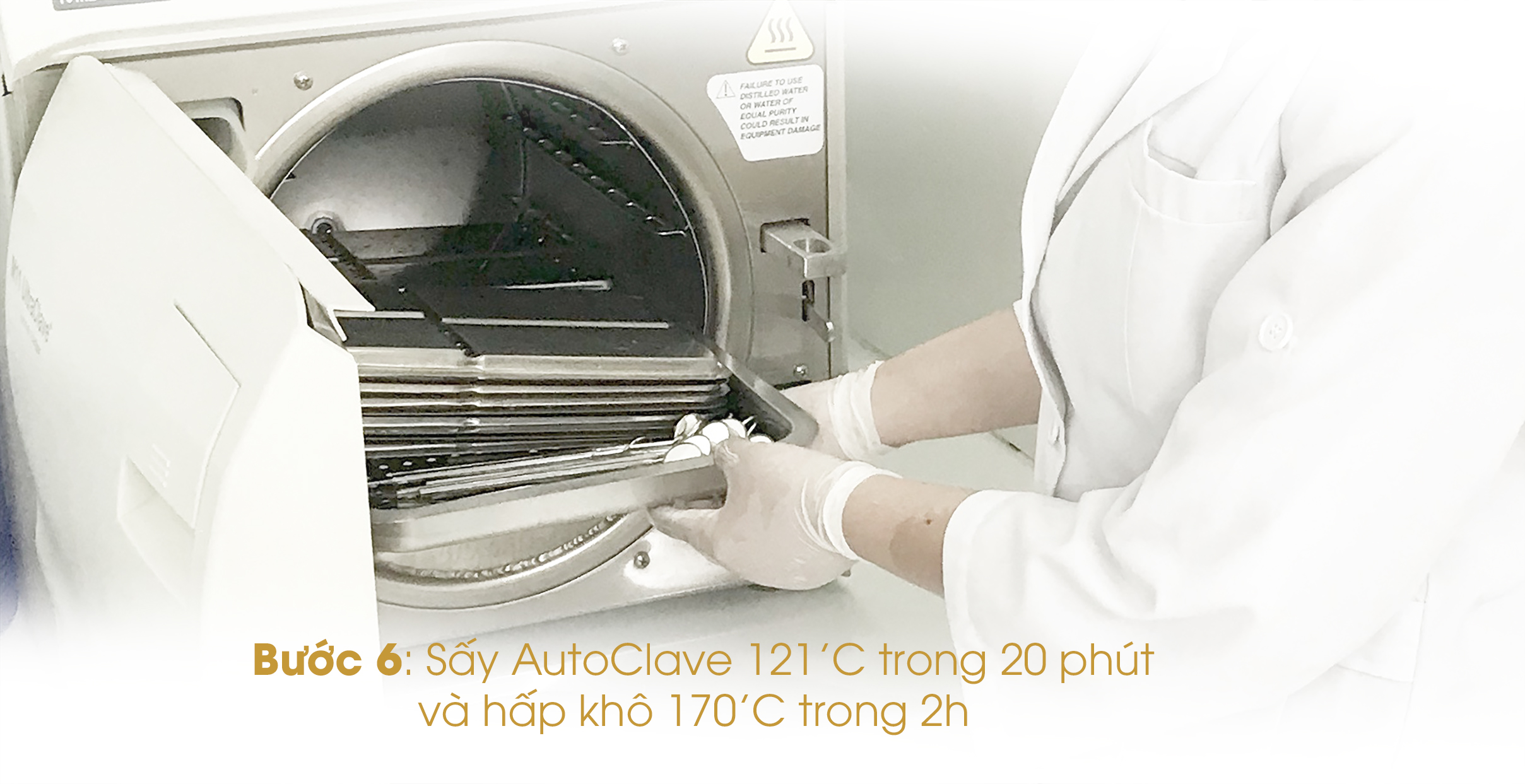 Dụng cụ sau khi đóng gói được vô trùng bằng máy AutoClave Midmark, đây là thiết bị nhập khẩu trực tiếp từ Mỹ, được công nhận là thế hệ máy tiệt khuẩn Top 3 thế giới. Các dụng cụ được sấy AutoClave 121’C trong 20 phút và hấp khô 170’C trong 2h. Sau bước này, dụng cụ đã được vô trùng tuyệt đối trước khi lưu trữ cho lần dùng sau.