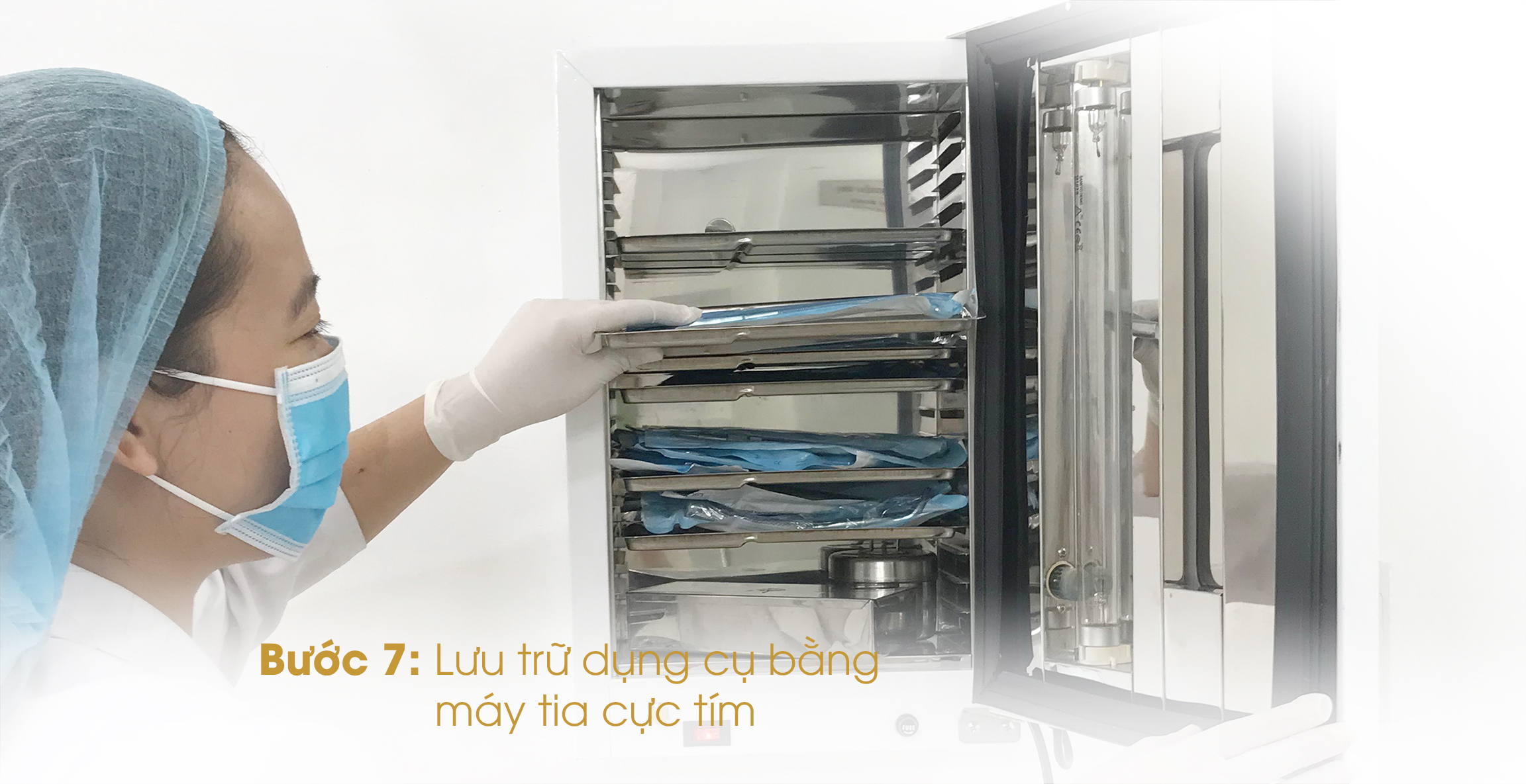 Dụng cụ sau khi vô trùng được giữ nguyên trong bao và lưu trữ trong máy tia cực tím. Lưu trữ bằng máy tia cực tím giúp dụng cụ được bảo quản trong môi trường hoàn toàn vô trùng, đảm bảo vệ sinh tuyệt đối cho đến ca điều trị tiếp theo. Bệnh nhân sẽ không cần lo lắng vấn đề vệ sinh dụng cụ trước khi điều trị, vì dụng cụ đã được vô trùng và luôn lưu trữ sẵn sàng trước mỗi ca.